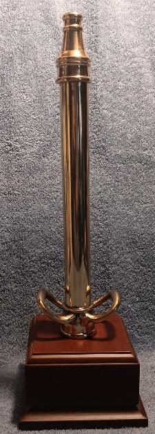 Brass Hose Nozzle Award Brass hose nozzle award with a cherry base. Measures 14" tall, base measures 4 1/2" x 4 1/2" x 2 3/4" high. Great award for any fireman. Doess not include name plates. They can be purchased for an extra cost. Email for price. Allow 10 - 14 day for delivery |