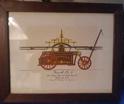 | Framed colored print of Hunneman handtub Carroll #2 of Wolfsboro, NH. Has history of engine and the print on the back. Measures 16 1/8" x 13 1/8" |